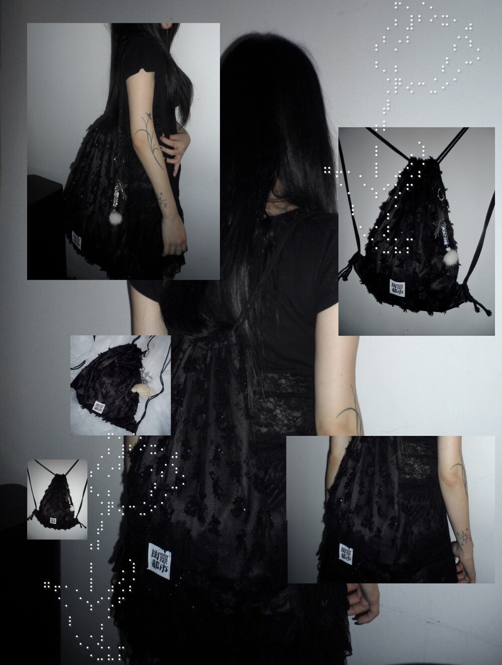 새틴 원단과 레이스 원단 두장으로 제작된 스트링 백 입니다. 스트링으로 길이를 조절 할 수 있습니다.